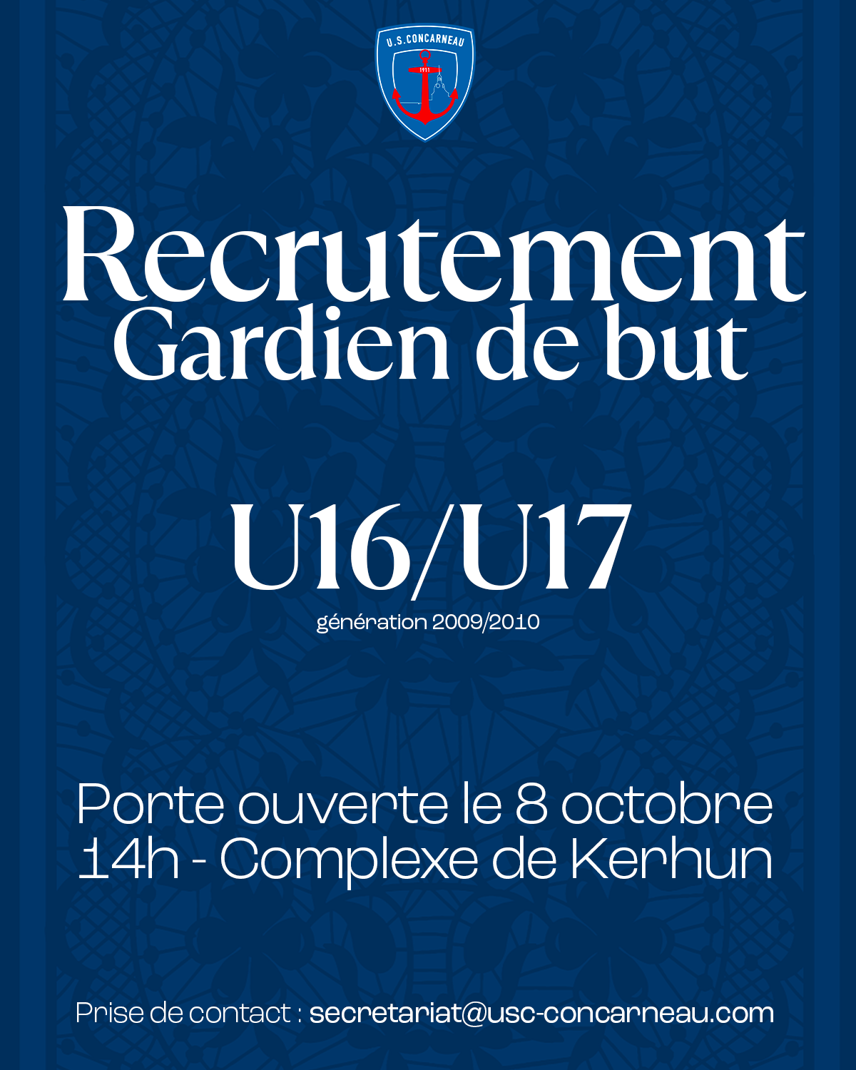 Recrutement – Gardien U16/U17 (Générations 2009/2010)Dans le cadre de la réorganisation de ses effectifs, l’US Concarneau recherche un gardien de but pour ses équipes U16/U17 (joueurs nés en 2009 ou 2010).Afin de permettre aux candidats de se présenter, le club organise une séance portes ouvertes le mercredi 8 octobre à 14h00 au complexe sportif de...