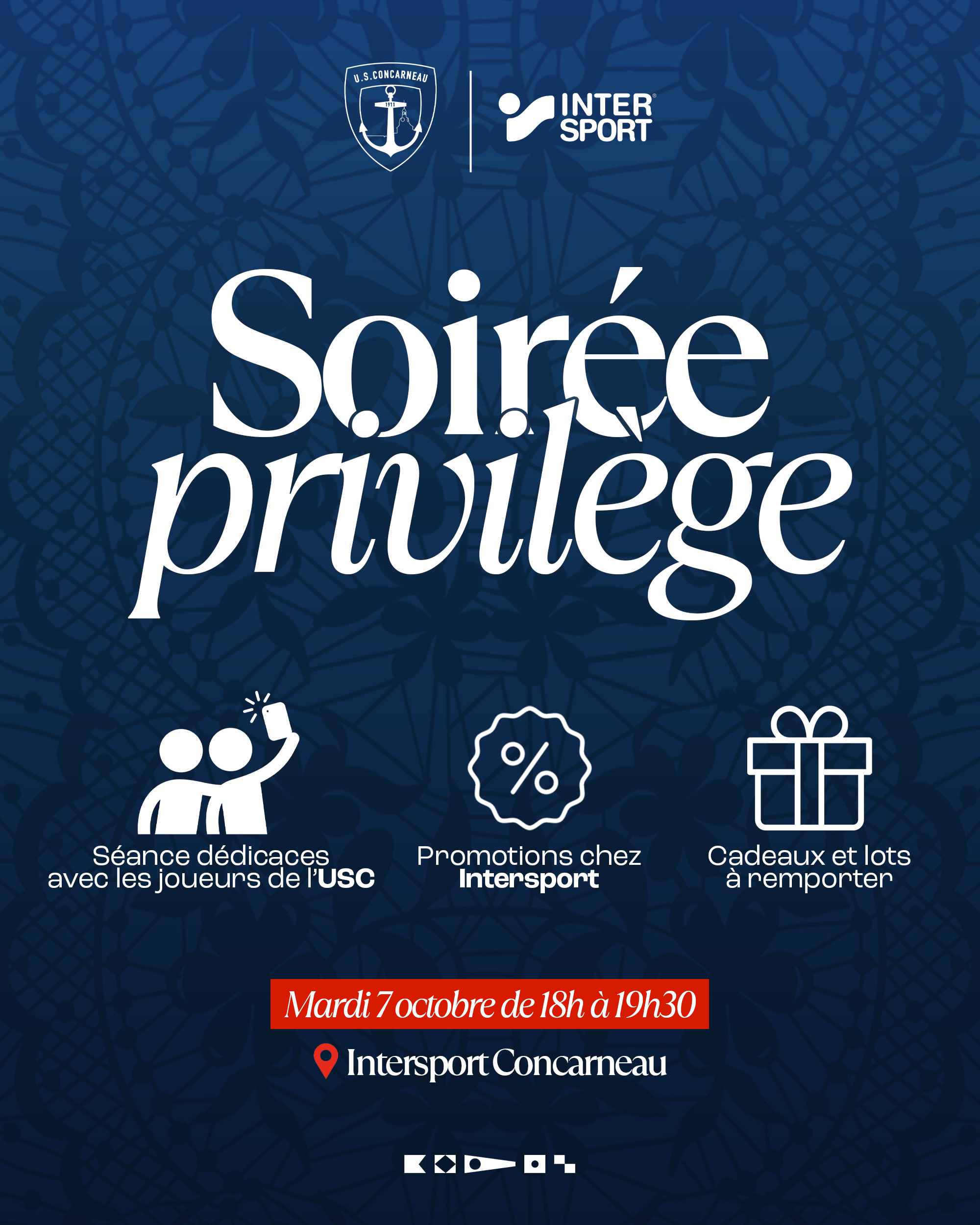 Soirée spéciale USC x Intersport ConcarneauL’US Concarneau et son partenaire Intersport ont le plaisir de convier l’ensemble de la Famille USC – abonnés, licenciés, bénévoles et partenaires – à une soirée exclusive.Date : mardi 7 octobreHoraires : de 18h à 19h30Lieu : Intersport ConcarneauAu programme :Réductions exceptionnelles de 15 % à 30 % sur tout le magasin Rencontre...